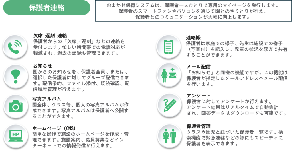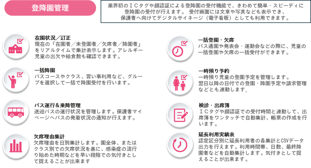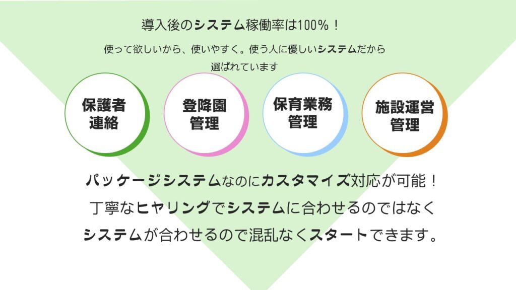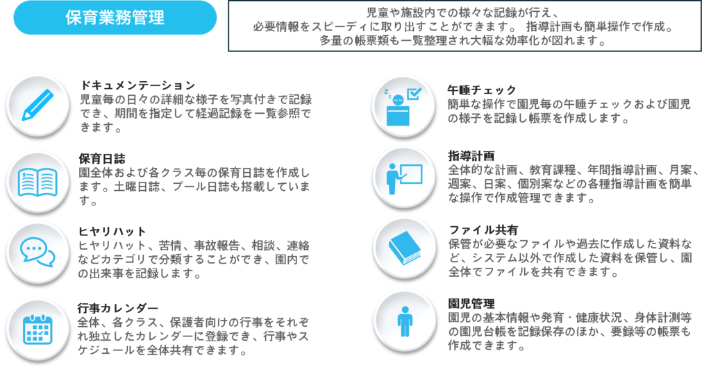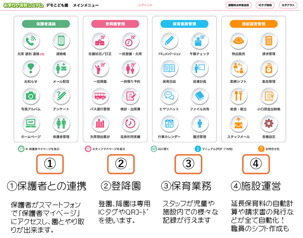 豊富な機能を有しながら、4つの業務ブロック(保護者連絡/登降園管理/保育業務管理/施設運営管理)に分けたメニュー構成で、操作マニュアルを見なくても直感的に操作できるように設計・デザインされています。
